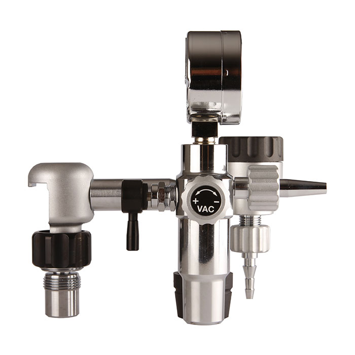 Suction- and atomizer-unit HABICHT cylinder connection combi-unit, medical pressure reducer with high-pressure inlet fitting, adjusted pressure 500 kpa (5 bar), content pressure gauge, ejector with vacuum-gauge, flowmeter with needle valve to adjust the flow, fast-shut-off valve without overflow or atomizer bottle gas:     oxygen incoming: high-pressure inlet fitting in line with DIN 477, No. 9 output:     hose connector / vacuum-hose connecotr capacity:     0...15 l/min